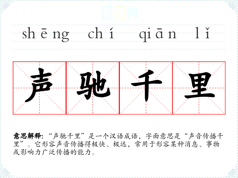 “声驰千里”是一个汉语成语,字面意思是“声音传播千里”。它形容声音传播得极快、极远,常用于形容某种消息、事物或影响力广泛传播的能力。
