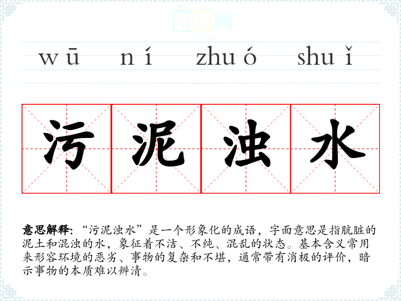 “污泥浊水”是一个形象化的成语,字面意思是指肮脏的泥土和混浊的水,象征着不洁、不纯、混乱的状态。基本含义常用来形容环境的恶劣、事物的复杂和不堪,通常带有消极的评价,暗示事物的本质难以辨清。
