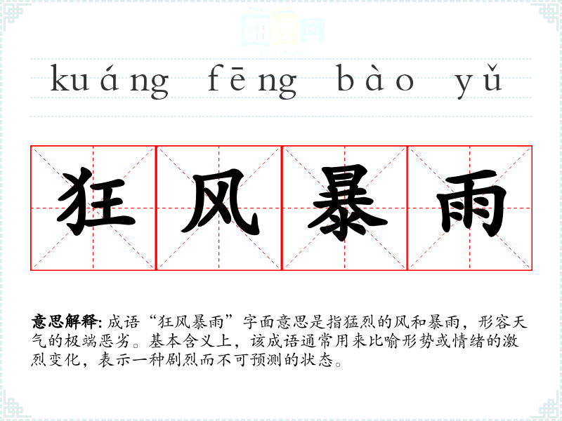 成语“狂风暴雨”字面意思是指猛烈的风和暴雨,形容天气的极端恶劣。基本含义上,该成语通常用来比喻形势或情绪的激烈变化,表示一种剧烈而不可预测的状态。