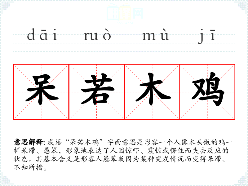 成语“呆若木鸡”字面意思是形容一个人像木头做的鸡一样呆滞、愚笨,形象地表达了人因惊吓、震惊或愣住而失去反应的状态。其基本含义是形容人愚笨或因为某种突发情况而变得呆滞、不知所措。