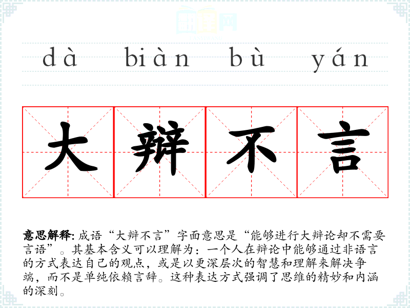 成语“大辩不言”字面意思是“能够进行大辩论却不需要言语”。其基本含义可以理解为:一个人在辩论中能够通过非语言的方式表达自己的观点,或是以更深层次的智慧和理解来解决争端,而不是单纯依赖言辞。这种表达方式强调了思维的精妙和内涵的深刻。
