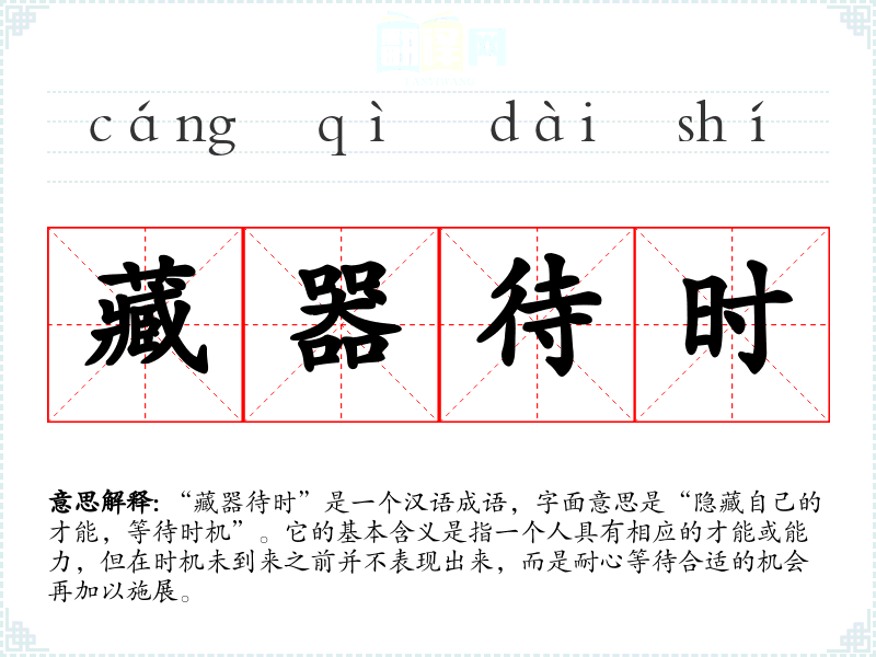 “藏器待时”是一个汉语成语,字面意思是“隐藏自己的才能,等待时机”。它的基本含义是指一个人具有相应的才能或能力,但在时机未到来之前并不表现出来,而是耐心等待合适的机会再加以施展。