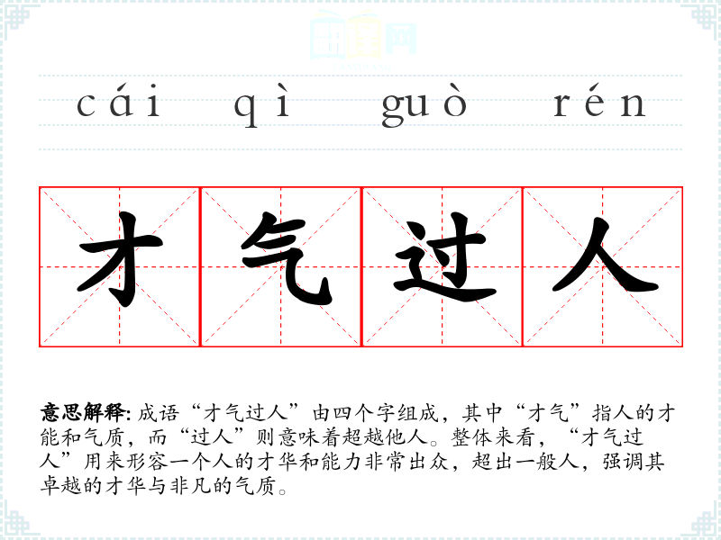 成语“才气过人”由四个字组成,其中“才气”指人的才能和气质,而“过人”则意味着超越他人。整体来看,“才气过人”用来形容一个人的才华和能力非常出众,超出一般人,强调其卓越的才华与非凡的气质。