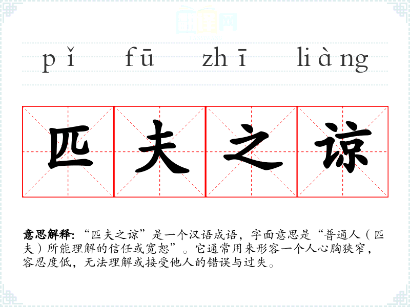 “匹夫之谅”是一个汉语成语,字面意思是“普通人(匹夫)所能理解的信任或宽恕”。它通常用来形容一个人心胸狭窄,容忍度低,无法理解或接受他人的错误与过失。