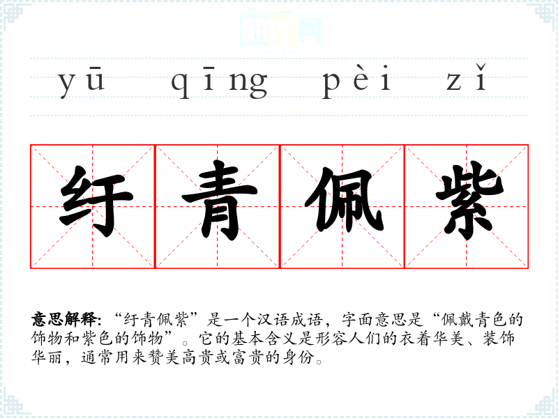 “纡青佩紫”是一个汉语成语,字面意思是“佩戴青色的饰物和紫色的饰物”。它的基本含义是形容人们的衣着华美、装饰华丽,通常用来赞美高贵或富贵的身份。