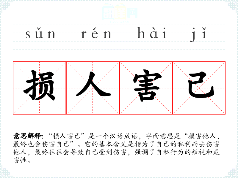 “损人害己”是一个汉语成语,字面意思是“损害他人,最终也会伤害自己”。它的基本含义是指为了自己的私利而去伤害他人,最终往往会导致自己受到伤害,强调了自私行为的短视和危害性。