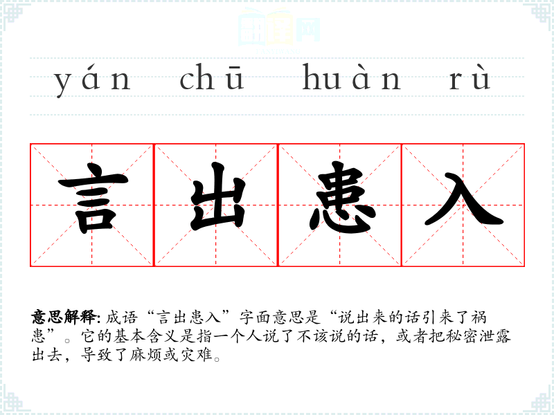 成语“言出患入”字面意思是“说出来的话引来了祸患”。它的基本含义是指一个人说了不该说的话,或者把秘密泄露出去,导致了麻烦或灾难。