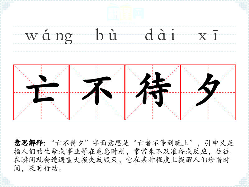 “亡不待夕”字面意思是“亡者不等到晚上”,引申义是指人们的生命或事业等在危急时刻,常常来不及准备或反应,往往在瞬间就会遭遇重大损失或毁灭。它在某种程度上提醒人们珍惜时间,及时行动。
