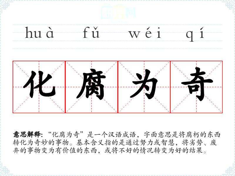| 化腐成奇 | 指变坏为好,变死板为灵巧或变无用为有用。 |