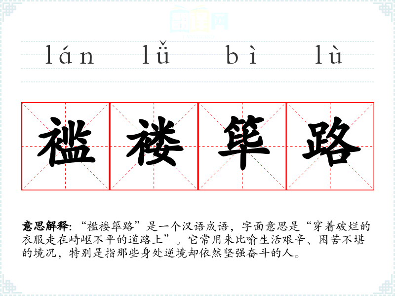 “褴褛筚路”是一个汉语成语,字面意思是“穿着破烂的衣服走在崎岖不平的道路上”。它常用来比喻生活艰辛、困苦不堪的境况,特别是指那些身处逆境却依然坚强奋斗的人。