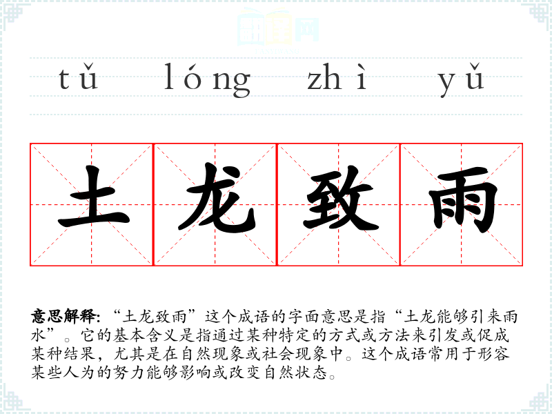 “土龙致雨”这个成语的字面意思是指“土龙能够引来雨水”。它的基本含义是指通过某种特定的方式或方法来引发或促成某种结果,尤其是在自然现象或社会现象中。这个成语常用于形容某些人为的努力能够影响或改变自然状态。