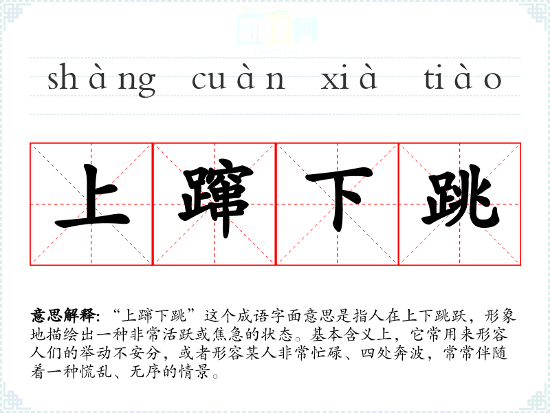 “上蹿下跳”这个成语字面意思是指人在上下跳跃,形象地描绘出一种非常活跃或焦急的状态。基本含义上,它常用来形容人们的举动不安分,或者形容某人非常忙碌、四处奔波,常常伴随着一种慌乱、无序的情景。