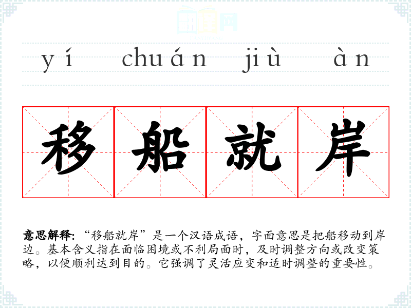 “移船就岸”是一个汉语成语,字面意思是把船移动到岸边。基本含义指在面临困境或不利局面时,及时调整方向或改变策略,以便顺利达到目的。它强调了灵活应变和适时调整的重要性。
