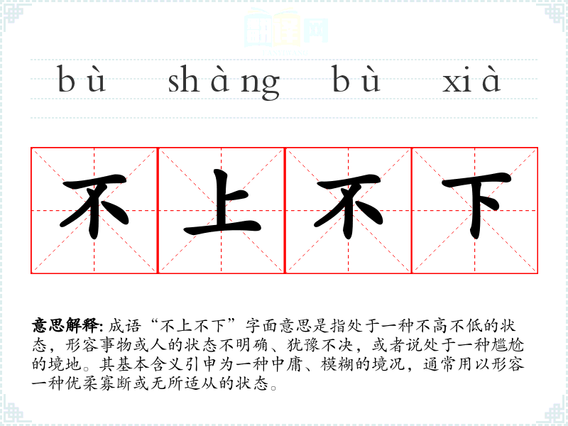 成语“不上不下”字面意思是指处于一种不高不低的状态,形容事物或人的状态不明确、犹豫不决,或者说处于一种尴尬的境地。其基本含义引申为一种中庸、模糊的境况,通常用以形容一种优柔寡断或无所适从的状态。