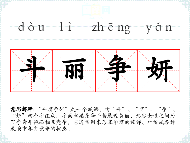 “斗丽争妍”是一个成语,由“斗”、“丽”、“争”、“妍”四个字组成。字面意思是争斗着展现美丽,形容女性之间为了争奇斗艳而相互竞争。它通常用来形容华丽的装饰、打扮或各种表演中各自竞争的状态。