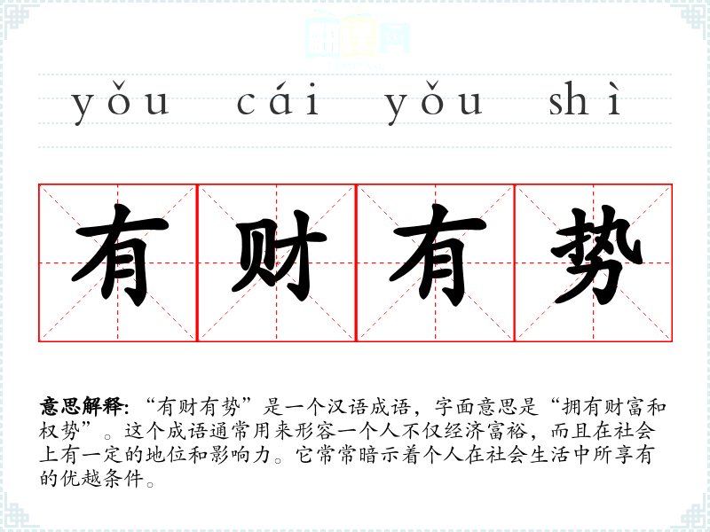 “有财有势”是一个汉语成语,字面意思是“拥有财富和权势”。这个成语通常用来形容一个人不仅经济富裕,而且在社会上有一定的地位和影响力。它常常暗示着个人在社会生活中所享有的优越条件。