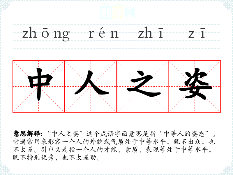 “中人之姿”这个成语字面意思是指“中等人的姿态”。它通常用来形容一个人的外貌或气质处于中等水平,既不出众,也不太差。引申义是指一个人的才能、素质、表现等处于中等水平,既不特别优秀,也不太差劲。