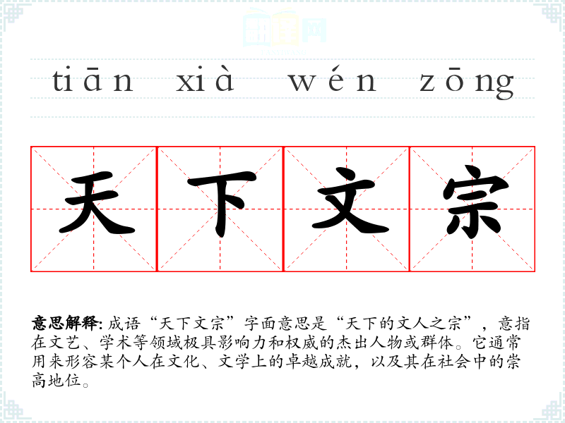 成语“天下文宗”字面意思是“天下的文人之宗”,意指在文艺、学术等领域极具影响力和权威的杰出人物或群体。它通常用来形容某个人在文化、文学上的卓越成就,以及其在社会中的崇高地位。