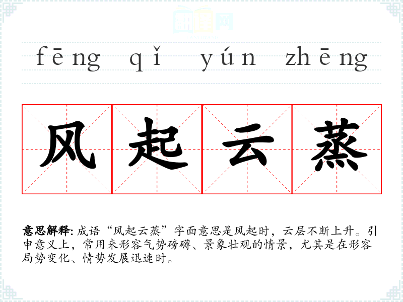 成语“风起云蒸”字面意思是风起时,云层不断上升。引申意义上,常用来形容气势磅礴、景象壮观的情景,尤其是在形容局势变化、情势发展迅速时。