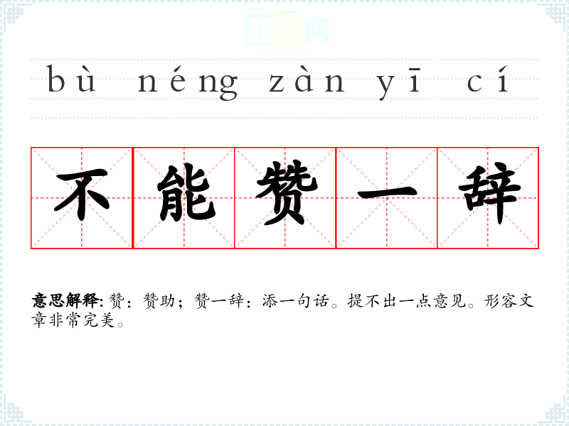 | 不能赞一辞 | 赞:赞助;赞一辞:添一句话。提不出一点意见。形容文章非常完美。 |