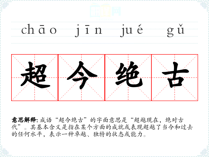 成语“超今绝古”的字面意思是“超越现在,绝对古代”。其基本含义是指在某个方面的成就或表现超越了当今和过去的任何水平,表示一种卓越、独特的状态或能力。