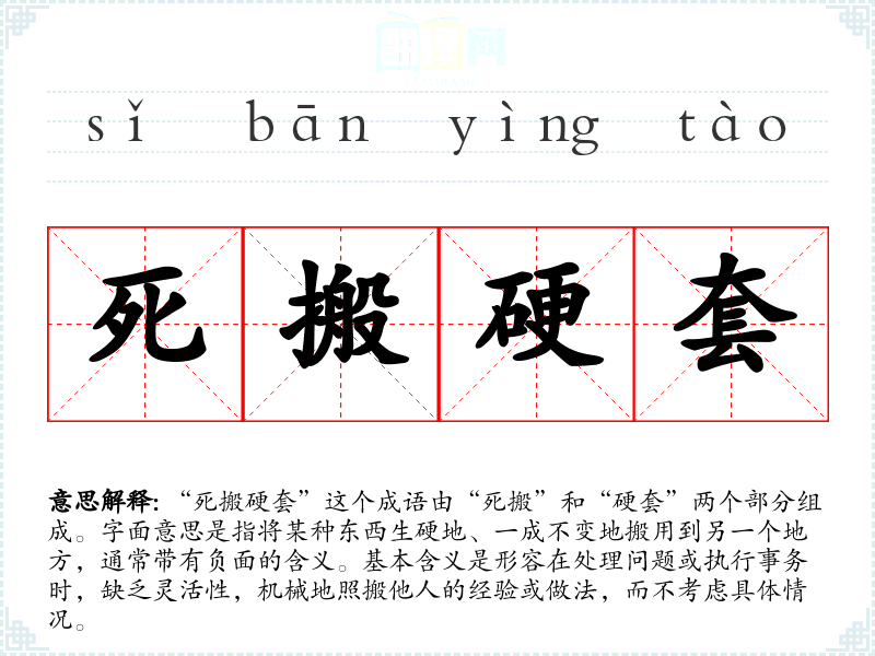 “死搬硬套”这个成语由“死搬”和“硬套”两个部分组成。字面意思是指将某种东西生硬地、一成不变地搬用到另一个地方,通常带有负面的含义。基本含义是形容在处理问题或执行事务时,缺乏灵活性,机械地照搬他人的经验或做法,而不考虑具体情况。