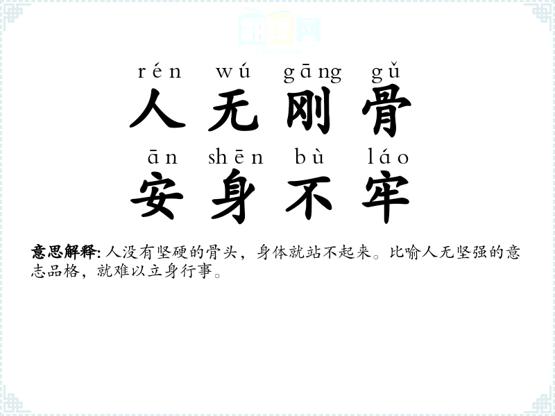 人没有坚硬的骨头,身体就站不起来。比喻人无坚强的意志品格,就难以立身行事。 |
