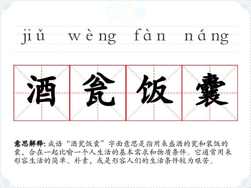 成语“酒瓮饭囊”字面意思是指用来盛酒的瓮和装饭的囊,合在一起比喻一个人生活的基本需求和物质条件。它通常用来形容生活的简单、朴素,或是形容人们的生活条件较为艰苦。