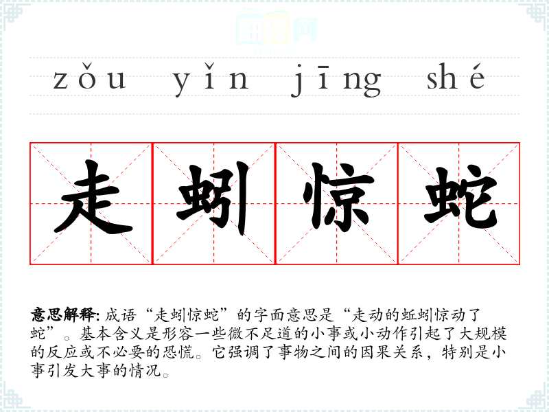 成语“走蚓惊蛇”的字面意思是“走动的蚯蚓惊动了蛇”。基本含义是形容一些微不足道的小事或小动作引起了***的反应或不必要的恐慌。它强调了事物之间的因果关系,特别是小事引发大事的情况。