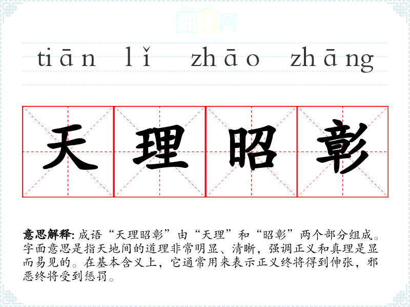 成语“天理昭彰”由“天理”和“昭彰”两个部分组成。字面意思是指天地间的道理非常明显、清晰,强调正义和真理是显而易见的。在基本含义上,它通常用来表示正义终将得到伸张,邪恶终将受到惩罚。