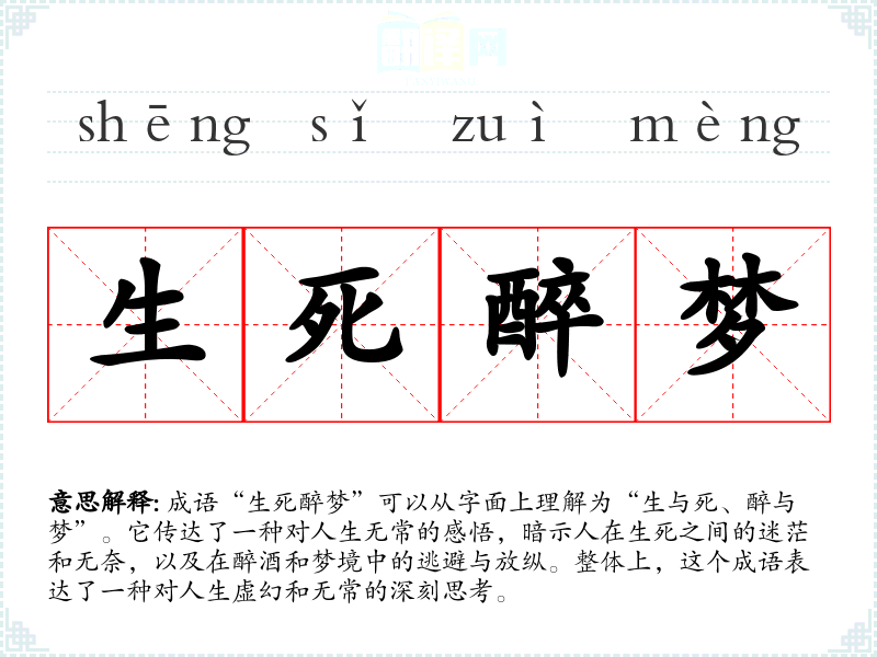 成语“生死醉梦”可以从字面上理解为“生与死、醉与梦”。它传达了一种对人生无常的感悟,暗示人在生死之间的迷茫和无奈,以及在醉酒和梦境中的逃避与放纵。整体上,这个成语表达了一种对人生虚幻和无常的深刻思考。