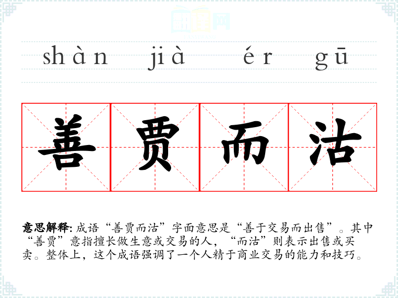 成语“善贾而沽”字面意思是“善于交易而出售”。其中“善贾”意指擅长做生意或交易的人,“而沽”则表示出售或买卖。整体上,这个成语强调了一个人精于商业交易的能力和技巧。