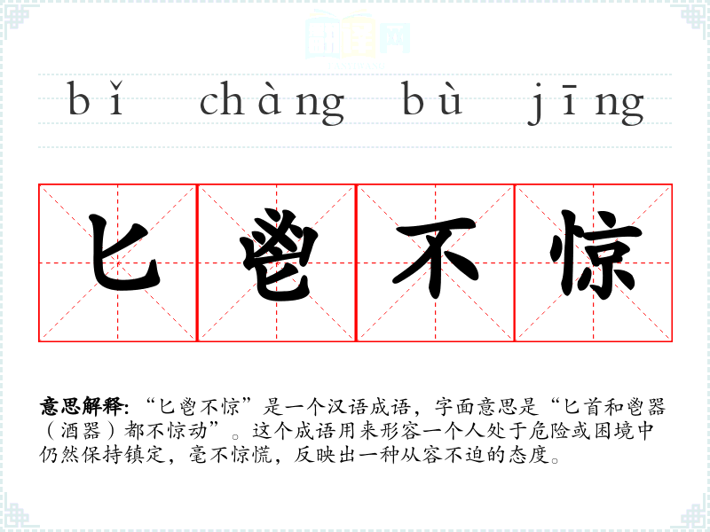 “匕鬯不惊”是一个汉语成语,字面意思是“匕首和鬯器(酒器)都不惊动”。这个成语用来形容一个人处于危险或困境中仍然保持镇定,毫不惊慌,反映出一种从容不迫的态度。