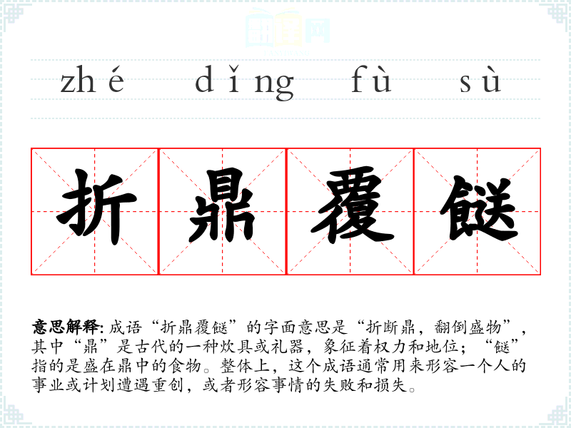 成语“折鼎覆餸”的字面意思是“折断鼎,翻倒盛物”,其中“鼎”是古代的一种炊具或礼器,象征着权力和地位;“餸”指的是盛在鼎中的食物。整体上,这个成语通常用来形容一个人的事业或计划遭遇重创,或者形容事情的失败和损失。