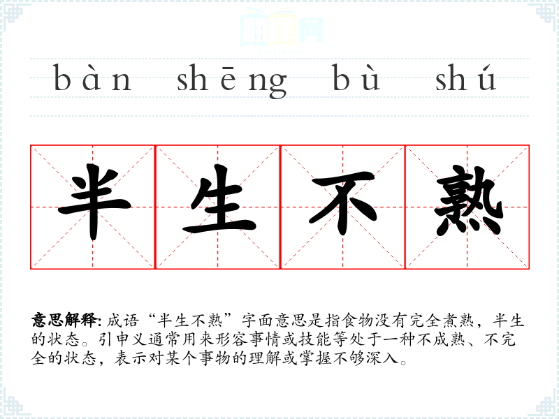 成语“半生不熟”字面意思是指食物没有完全煮熟,半生的状态。引申义通常用来形容事情或技能等处于一种不成熟、不完全的状态,表示对某个事物的理解或掌握不够深入。