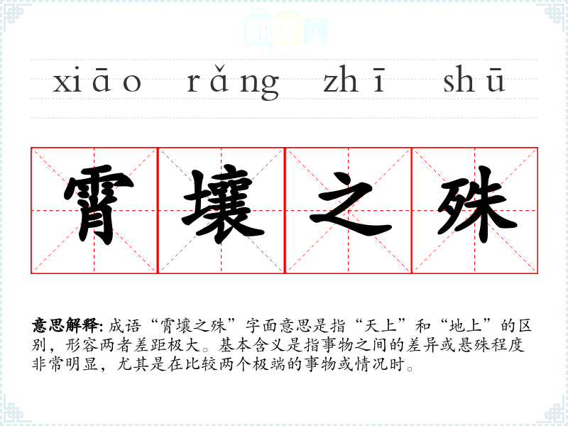 成语“霄壤之殊”字面意思是指“天上”和“地上”的区别,形容两者差距极大。基本含义是指事物之间的差异或悬殊程度非常明显,尤其是在比较两个极端的事物或情况时。