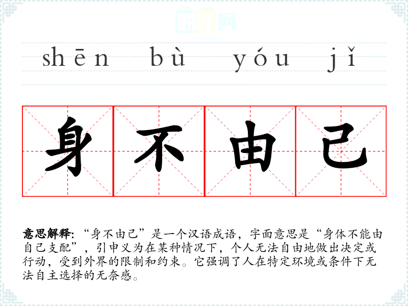 “身不由己”是一个汉语成语,字面意思是“身体不能由自己支配”,引申义为在某种情况下,个人无法自由地做出决定或行动,受到外界的限制和约束。它强调了人在特定环境或条件下无法自主选择的无奈感。