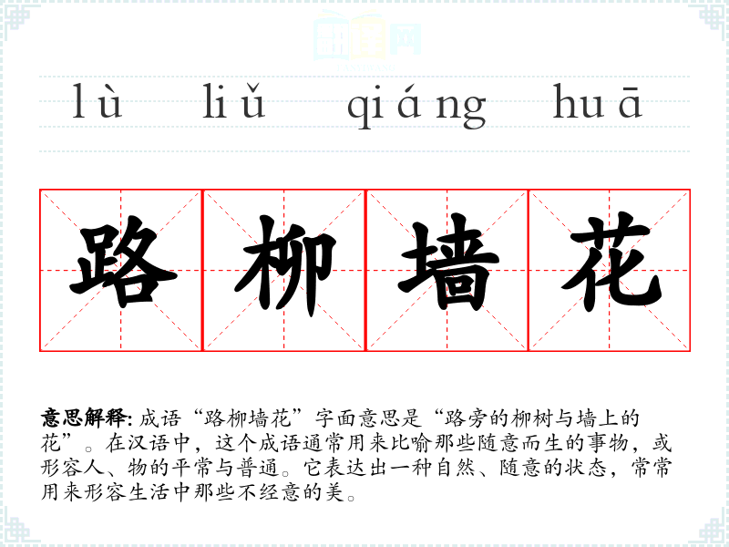 “路柳墙花”并没有一个确切的历史典故或文学出处,它可能源于古代文人对自然景物的观察与描写,反映出他们对生活细节的敏感与热爱。这一成语的构造呈现出一种自然的和谐,反映了**古代文人重视自然、崇尚简朴的思想。