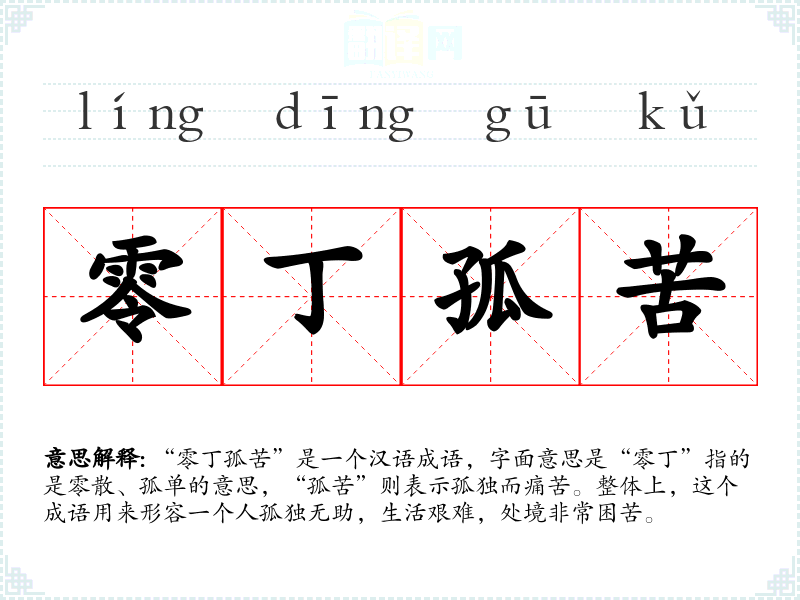“零丁孤苦”是一个汉语成语,字面意思是“零丁”指的是零散、孤单的意思,“孤苦”则表示孤独而痛苦。整体上,这个成语用来形容一个人孤独无助,生活艰难,处境非常困苦。