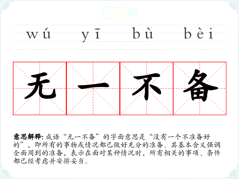 成语“无一不备”的字面意思是“没有一个不准备好的”,即所有的事物或情况都已做好充分的准备。其基本含义强调全面周到的准备,表示在面对某种情况时,所有相关的事项、条件都已经考虑并安排妥当。
