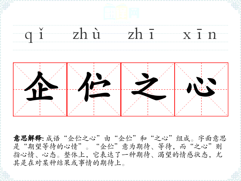 成语“企伫之心”由“企伫”和“之心”组成。字面意思是“期望等待的心情”。“企伫”意为期待、等待,而“之心”则指心情、心态。整体上,它表达了一种期待、渴望的情感状态,尤其是在对某种结果或事情的期待上。