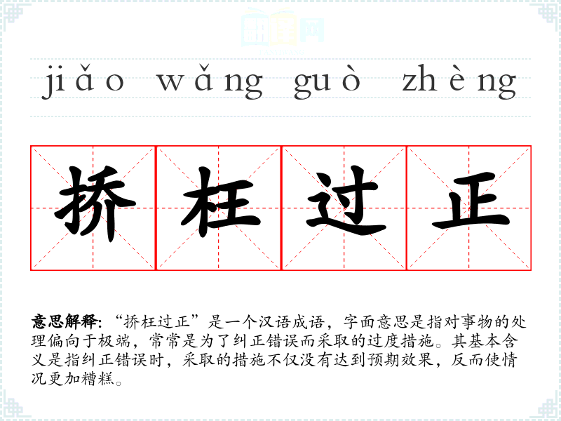 | 挢枉过正 | 指纠正偏差而超过必要的限度。 |