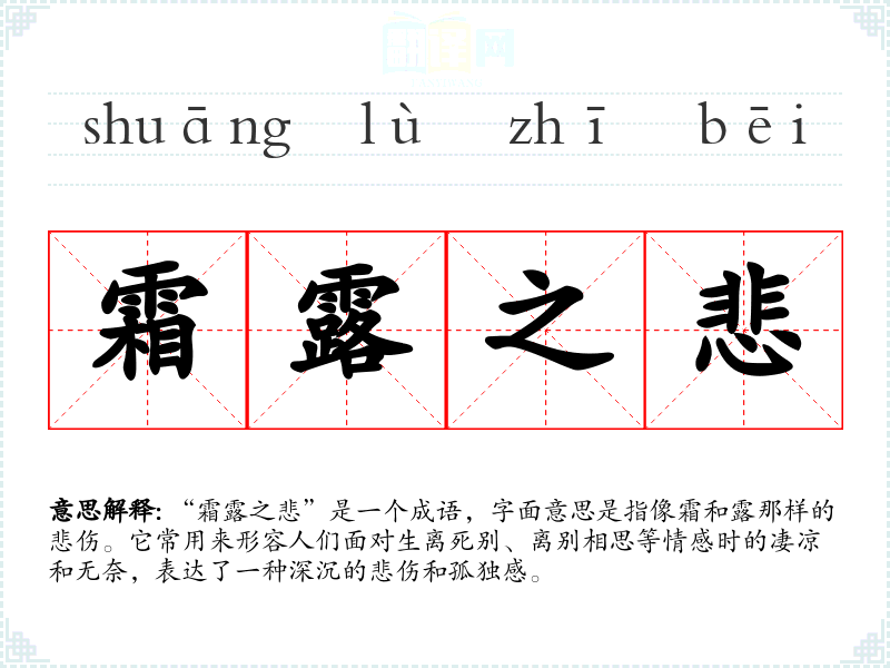 “霜露之悲”是一个成语,字面意思是指像霜和露那样的悲伤。它常用来形容人们面对生离死别、离别相思等情感时的凄凉和无奈,表达了一种深沉的悲伤和孤独感。