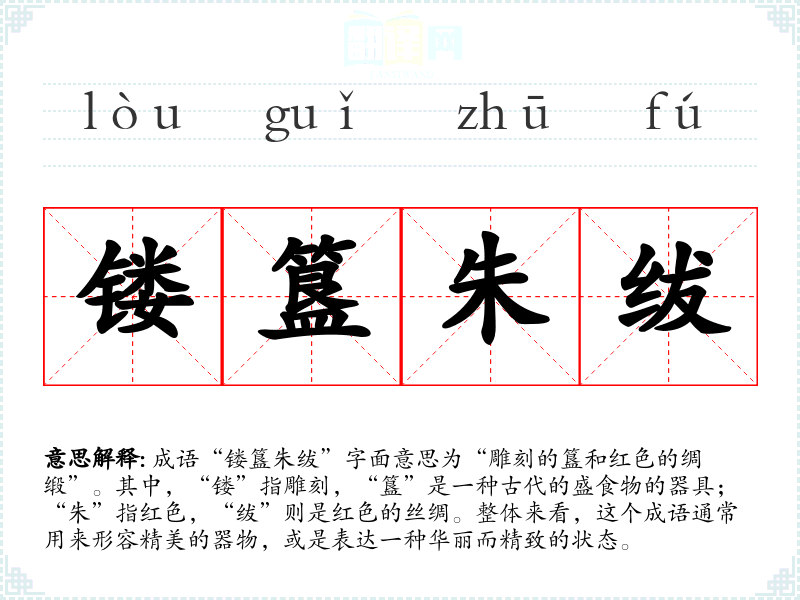 成语“镂簋朱绂”字面意思为“雕刻的簋和红色的绸缎”。其中,“镂”指雕刻,“簋”是一种古代的盛食物的器具;“朱”指红色,“绂”则是红色的丝绸。整体来看,这个成语通常用来形容精美的器物,或是表达一种华丽而精致的状态。