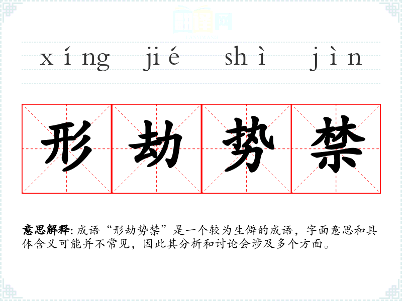 成语“形劫势禁”是一个较为生僻的成语,字面意思和具体含义可能并不常见,因此其分析和讨论会涉及多个方面。