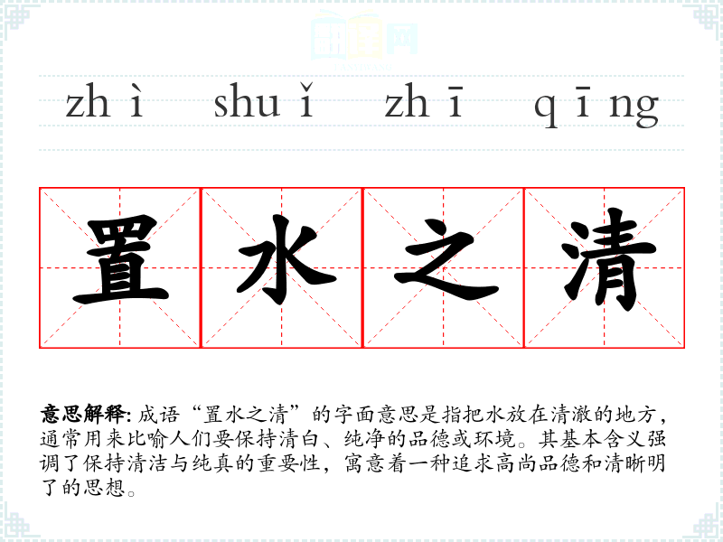 成语“置水之清”的字面意思是指把水放在清澈的地方,通常用来比喻人们要保持清白、纯净的品德或环境。其基本含义强调了保持清洁与纯真的重要性,寓意着一种追求高尚品德和清晰明了的思想。