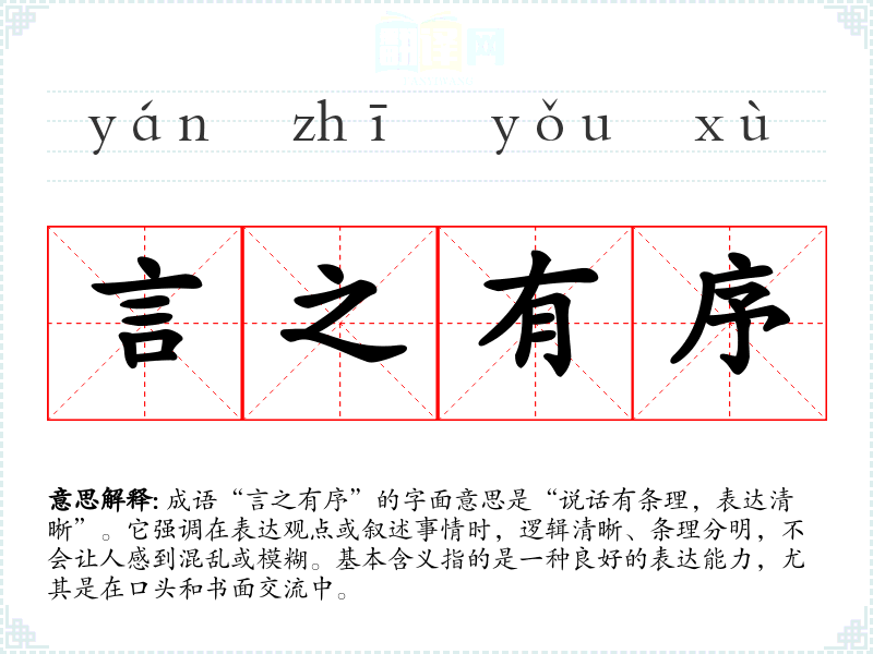 成语“言之有序”的字面意思是“说话有条理,表达清晰”。它强调在表达观点或叙述事情时,逻辑清晰、条理分明,不会让人感到混乱或模糊。基本含义指的是一种良好的表达能力,尤其是在口头和书面交流中。