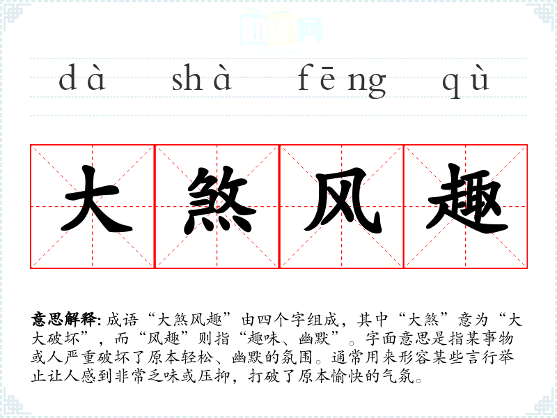 “大煞风趣”的确切来源不详,但它的使用可以追溯到古代文人的对话和文学作品中。它常用于描绘那些不懂得幽默、缺乏风趣的人,或是某些事情让人觉得索然无味的场景。成语的构成反映了古代汉语对风趣和幽默的重视,显示了文化中对生活趣味的追求。
