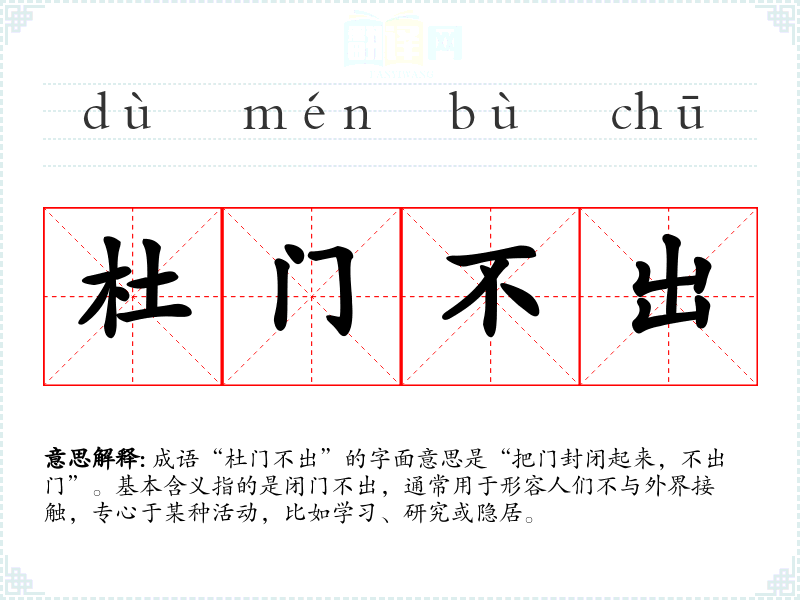 成语“杜门不出”的字面意思是“把门封闭起来,不出门”。基本含义指的是闭门不出,通常用于形容人们不与外界接触,专心于某种活动,比如学*、研究或隐居。