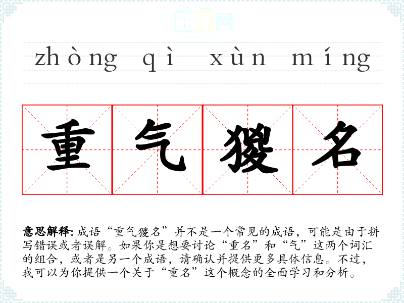 成语“重气猣名”并不是一个常见的成语,可能是由于拼写错误或者误解。如果你是想要讨论“重名”和“气”这两个词汇的组合,或者是另一个成语,请确认并提供更多具体信息。不过,我可以为你提供一个关于“重名”这个概念的全面学*和分析。